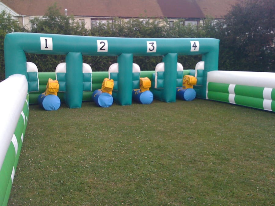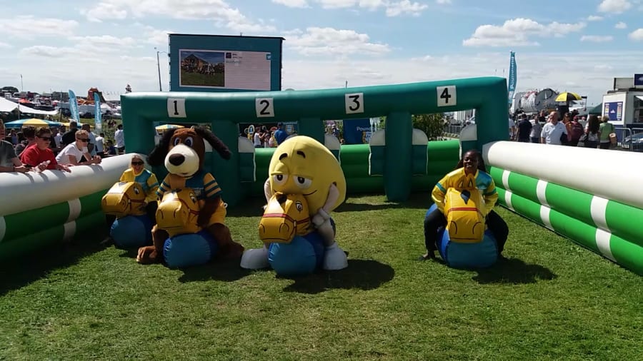 In Pony Hop racing, up to 4 contestants each sit astride their inflatable pony hopper on the start line. On the word “Go”, they bounce their way down the track to the finish line amid much cheering and laughter among the spectators – and there are some great photo-opportunities too.